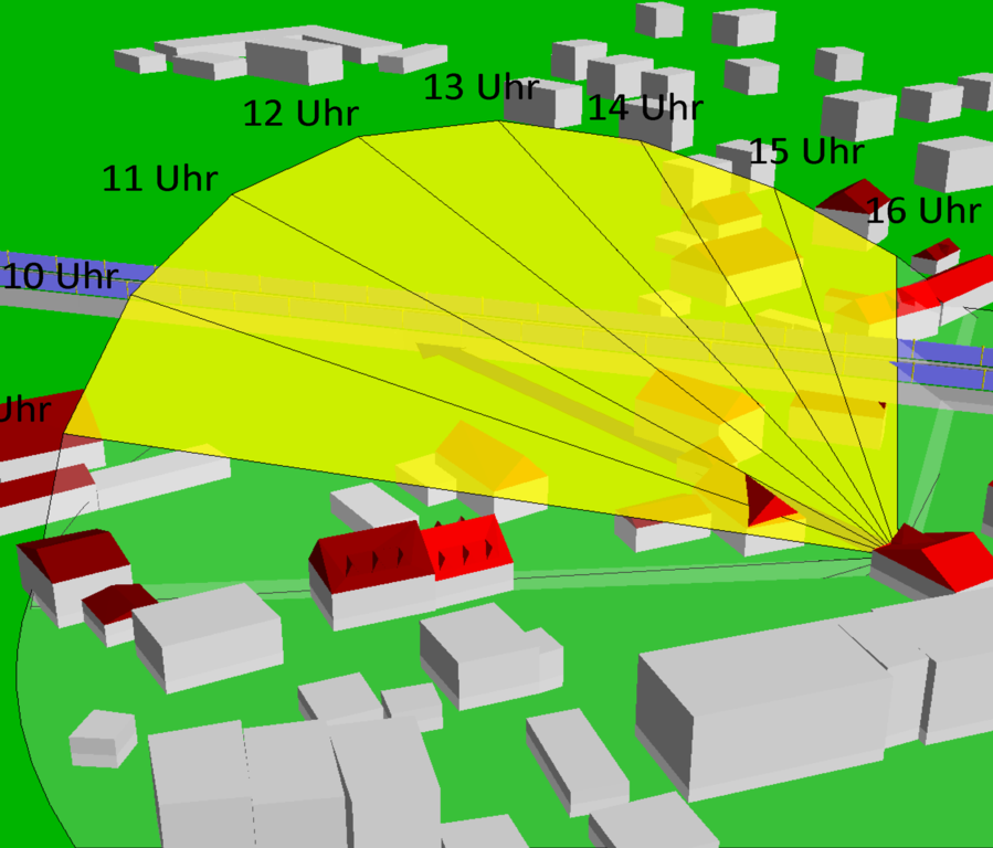 - Berechnung des Schattenwurfs und der dauerhaften Verschattung im Tages- und Jahresverlauf und Bewertung nach DIN 5034-1.