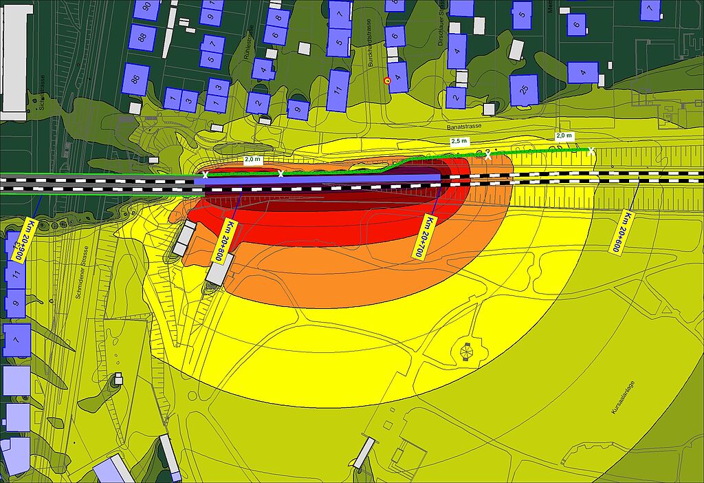 Calculation according to European and national guidelines, statistics on people affected by noise, concepts for measures and support concerning public participation for municipalities and cities.