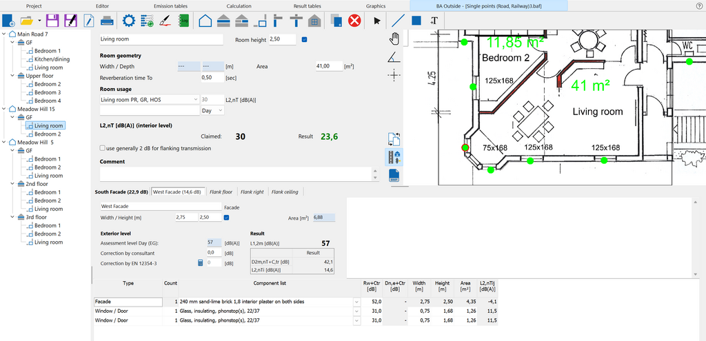 Con Acústica de Edificios Exterior, se puede considerar cualquier número de edificios, fachadas y componentes. La estructura clara simplifica la gestión incluso de grandes proyectos con cientos de edificios. Las fachadas de una sala pueden consistir en cualquier combinación de paredes, ventanas, puertas, cajas de persianas enrollables, sistemas de ventilación y superficies de techo. El cálculo incluye tanto la transmisión directa como la flanqueante.